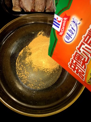 碗里放冰水35克与35克的烤翅调料搅拌均匀备用