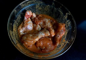 把翅根于腌泡汁搅拌均匀(食用油、酱油和蜂蜜也一同加入)