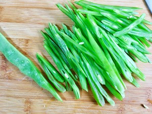 一、选用宽扁豆,好切,也容易熟。用圆豆角也行,可以不切丝,直接使用,时间上要延长。