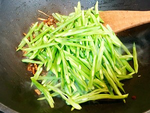 豆角丝炒熟后,倒入饼丝,翻拌均匀