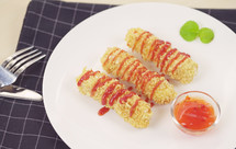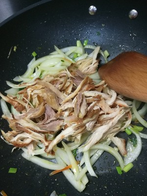 鸡肉手撕成肉丝,正好冰箱里有剩的烤鸡,可以换成火腿肠