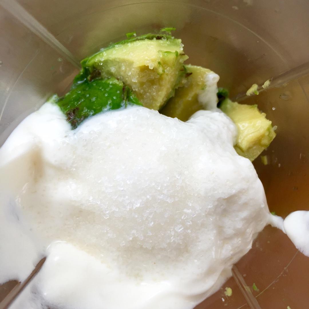 牛油果,香菜,蒜头,盐,青柠汁和希腊酸奶一起放到搅拌机里搅打顺滑
