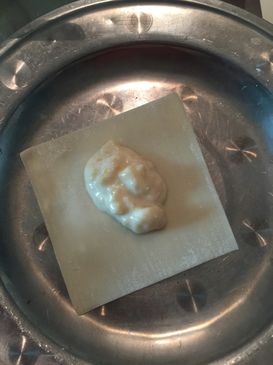 半匙香蕉糊放到馄饨皮中间,对折面皮。