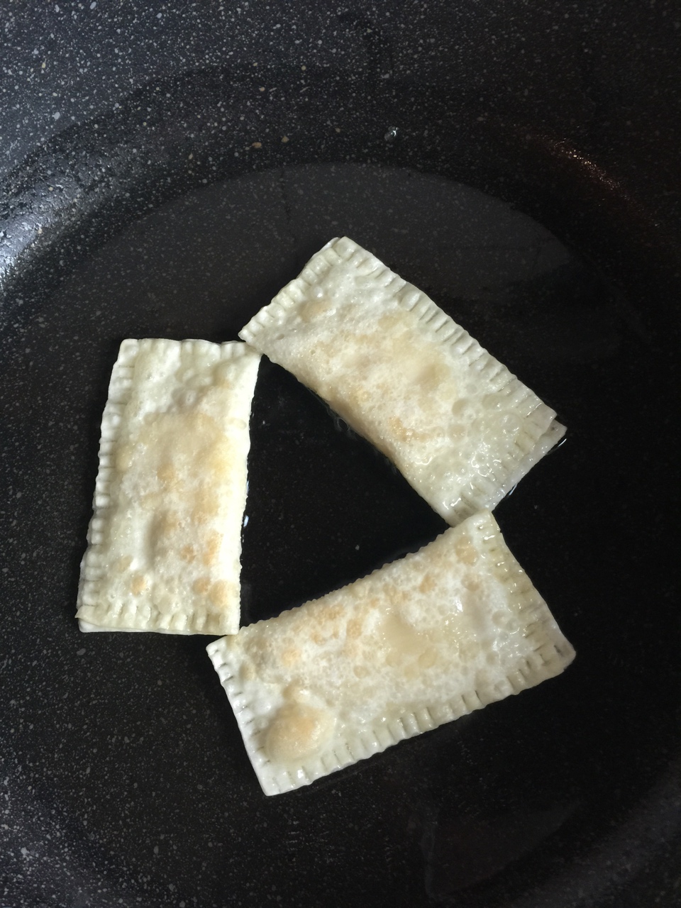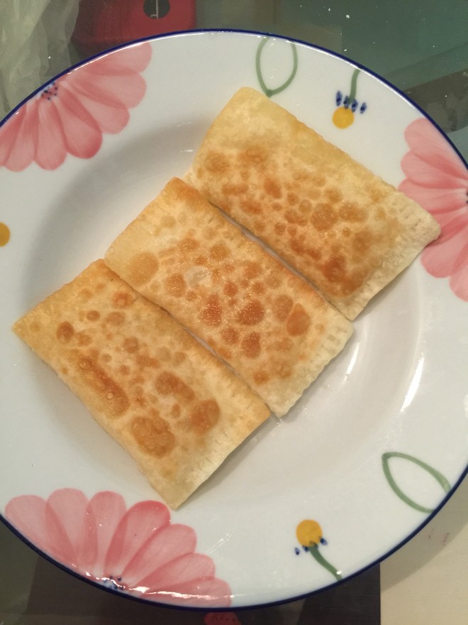 不粘锅放一点点油,小火,煎的面皮起泡了翻面,再煎一二分钟就可以了。外皮脆脆的,内馅又香又甜。