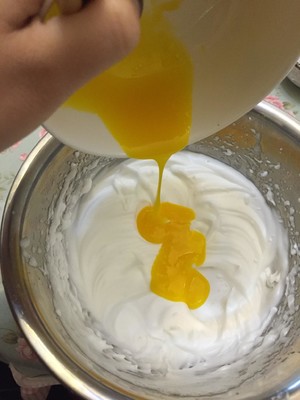 加入打散的蛋黄,将蛋黄蛋清混合均匀(请勿画圈搅拌,容易消泡。要像炒菜一样从下向上搅拌均匀)