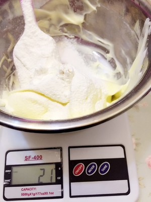 用筛子筛入奶粉和低筋粉继续搅拌均匀(切记不要画圈搅拌,像炒菜一样从下向上翻搅)