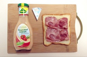 2. 取一片土司 加培根及千岛酱