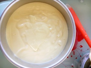 将混合好的面糊从高处倒入模具中(大约就400cm左右高处倒入吧……这样可以减少气泡的存在)然后可以用刮铲将表面进行一定的刮平整理…最后将模具轻震、排出较大气泡~#p#分页标题#e#