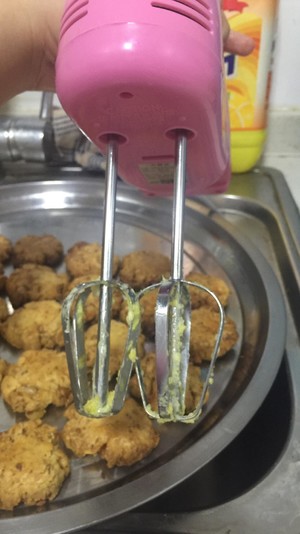把盐和糖混合,分两次加入黄油中,无论你用什么样的打蛋器,都只开1档就可以了!记得千万别把黄油打发!(糖粒拌均匀了就行,不用打化,有糖粒也是桃酥香酥的关键)