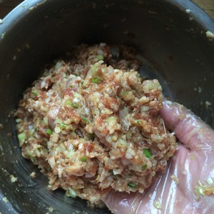 切好的莲菜倒进肉馅中,带一次性手套搅拌均匀。饺子馅就拌好了。