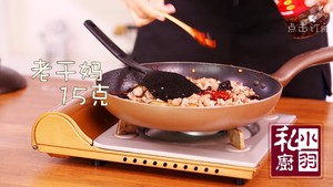 ▲再把之前炒好的肉末倒进去,加1大勺的老干妈,1小勺糖,一点点水,翻炒均匀