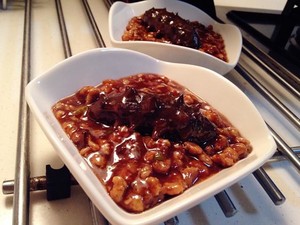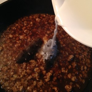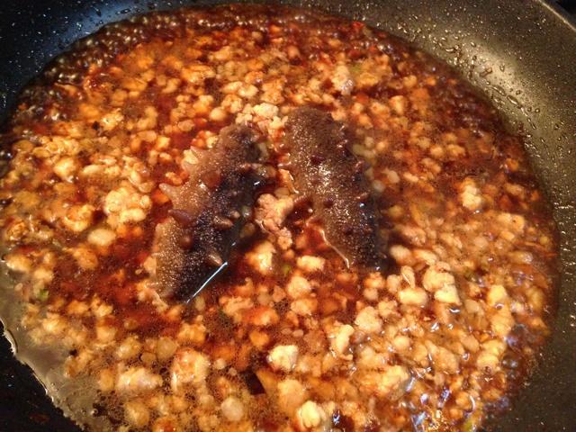 | 水发海参、猪肥瘦肉末、蒜末、葱末、蚝油、鸡汁、水淀粉适量。 | 适量 |