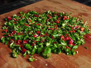 二荆条青椒和朝天椒闸碎。什么叫闸碎..就是模仿闸刀的样子保持刀尖不离地,手起刀落。这样是为了防止辣椒乱飞,如果不介意也可以剁碎。