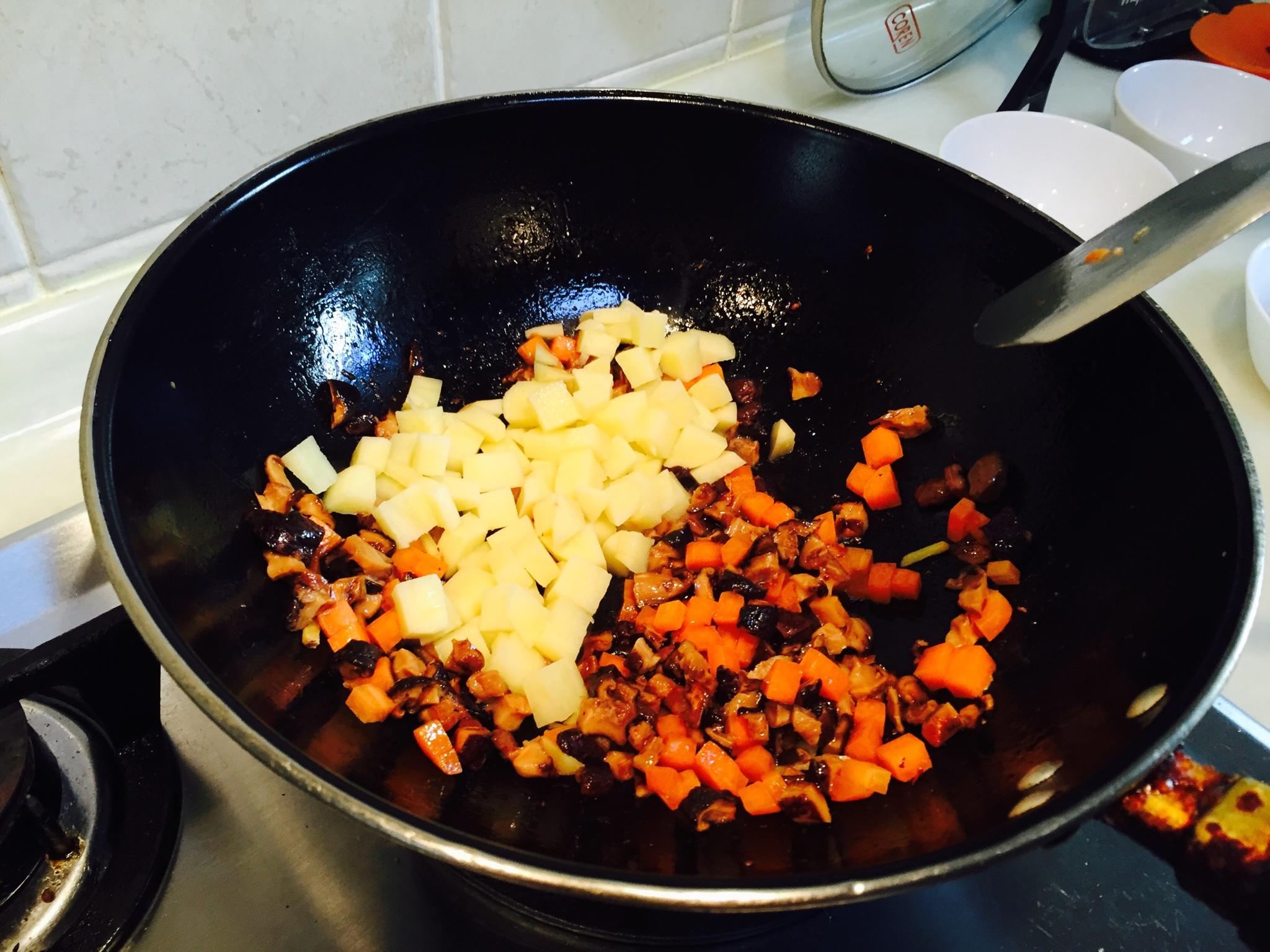 干香菇用热水泡发后和五花肉、土豆、胡萝卜一起分别切成小丁