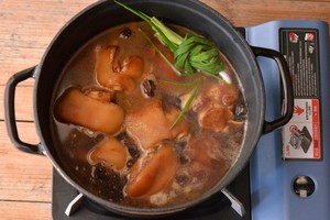另取铸铁锅将猪蹄放入,加入足量水,放入葱,盖上盖子,沸腾后转中小火至猪蹄软烂