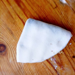 把两边往后翻捏在一起,用刀背压三道印子,猪蹄就做成了。