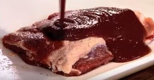 取一块猪肋排,用刀尖或者叉子在上面戳些小孔一遍入味。两面撒盐和黑胡椒粉腌制半小时,之后淋上打好的烧烤酱,酱料一定要没过肉,搁置过夜。