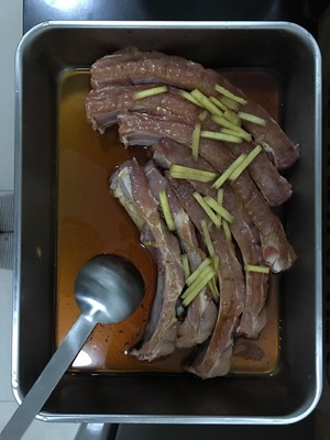 肋排流水洗净,准备腌制30分钟:两勺黄酒,两勺酱油,4片生姜切丝,再稍微加点糖(如果比我更懒,生姜和糖都可以省略)