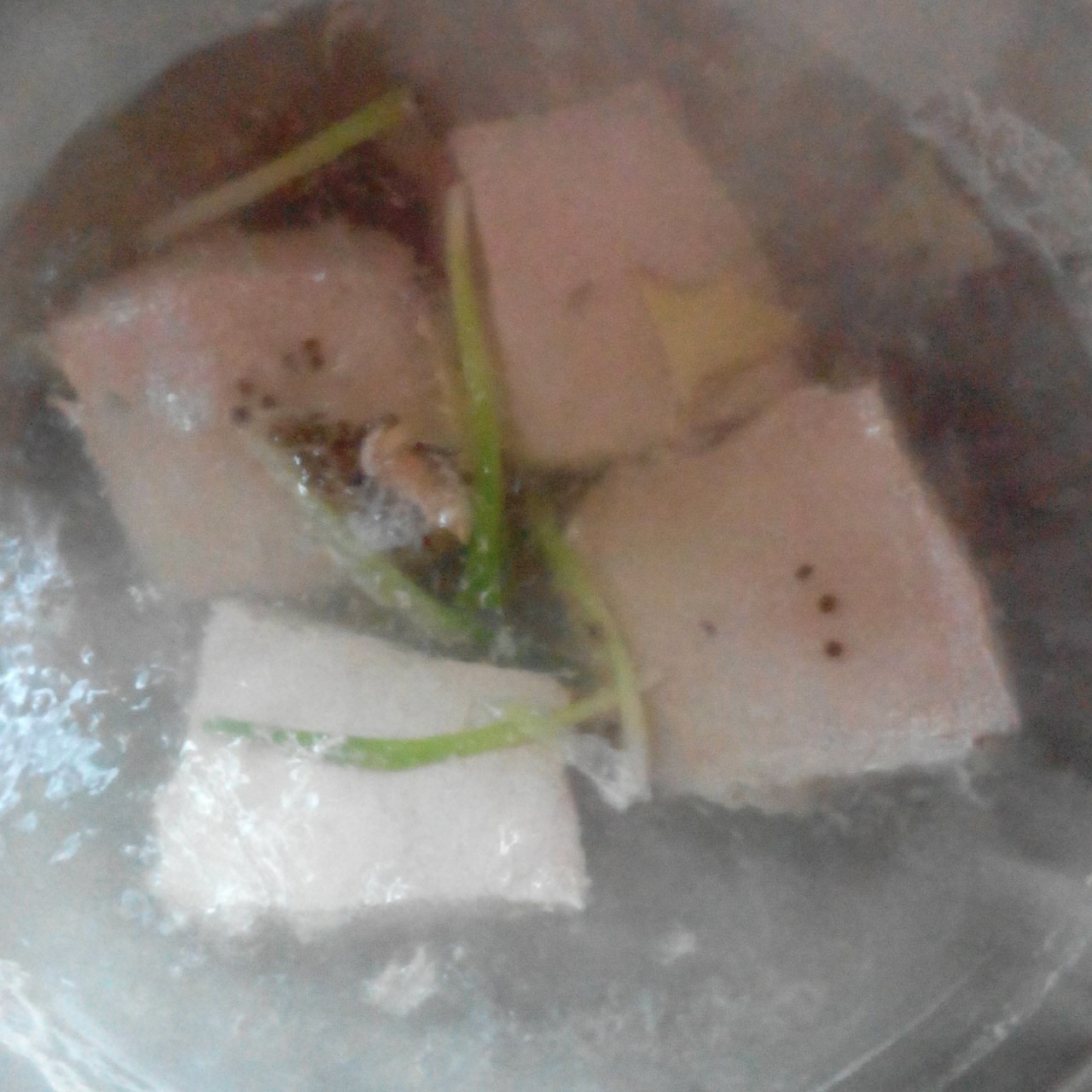 冷水入锅加几片生姜,两颗葱,一小把花椒,清水刚好盖过肉块盖上锅盖大火煮。