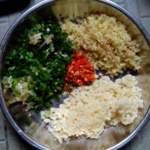 葱、姜、蒜、泡椒切茉。锅內放入少许花生油,油烧热,放入切好的葱姜蒜泡椒快速翻炒几下,倒出。