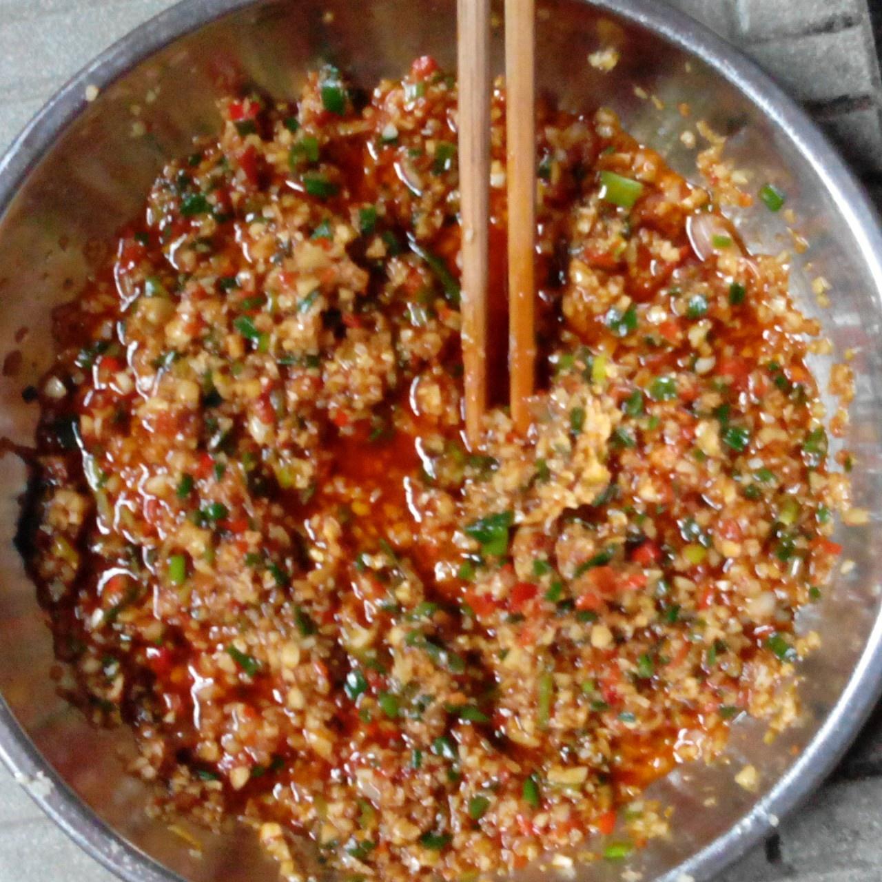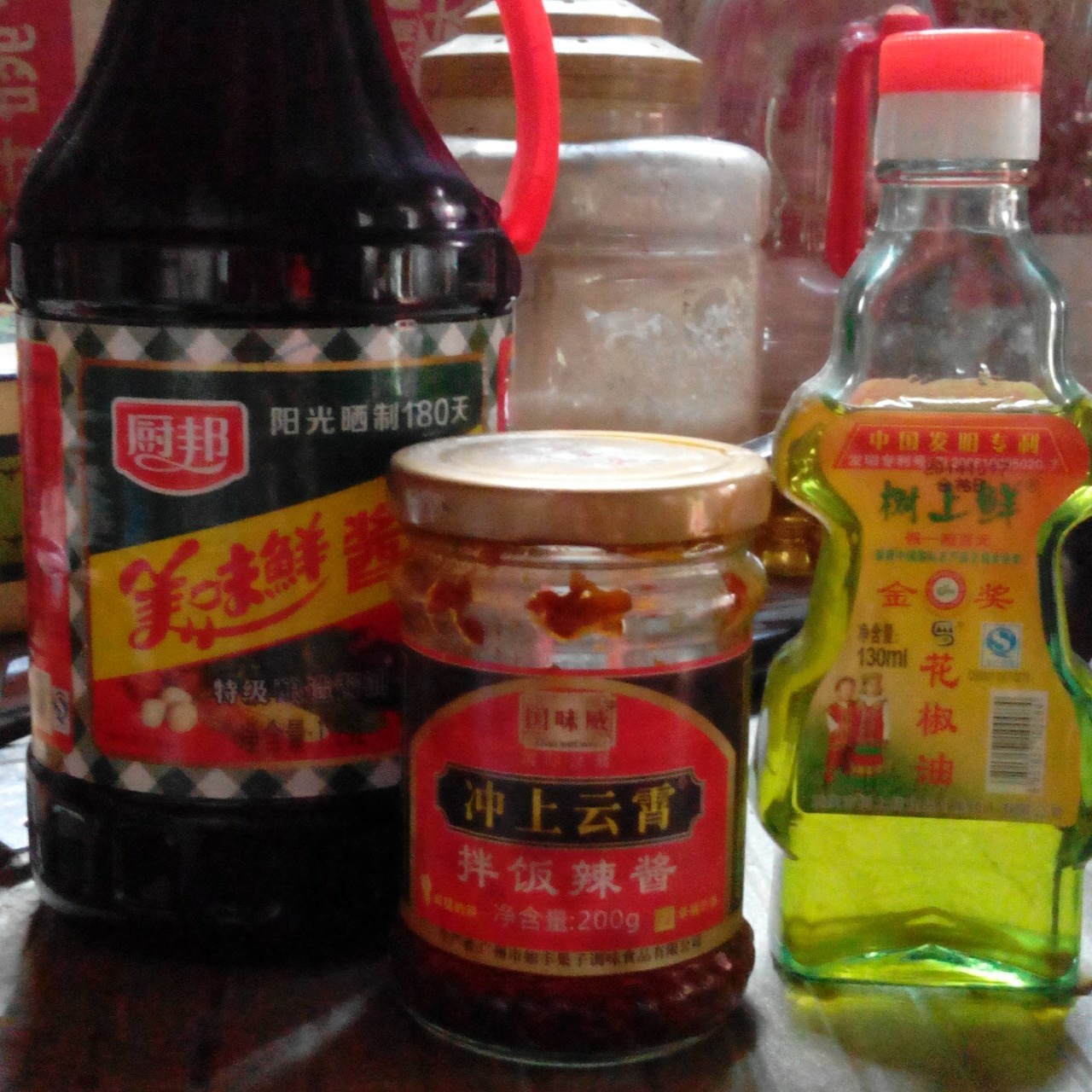 放酱油三勺、辣酱一勺、花椒油小半勺(怕麻的少放点,如果有香油的最好也放点。)醋少许。