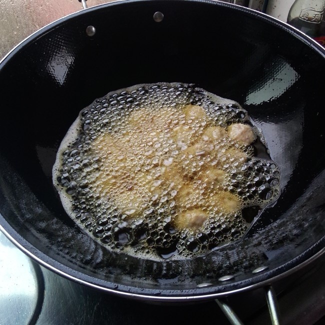 左手微捏拳,准备一小碗,倒入料酒,用勺子沾下料酒,左手挤出一点,小勺挖出放入油锅!