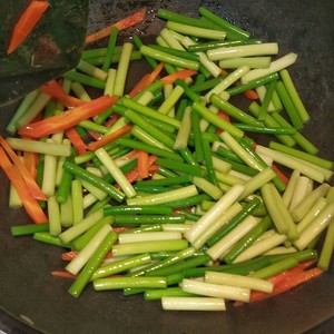 将蒜苔落入一同快炒均匀,炒至蒜苔转青;