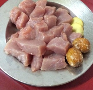 瘦肉洗干净切粒,加二片姜片,2个蜜栆。