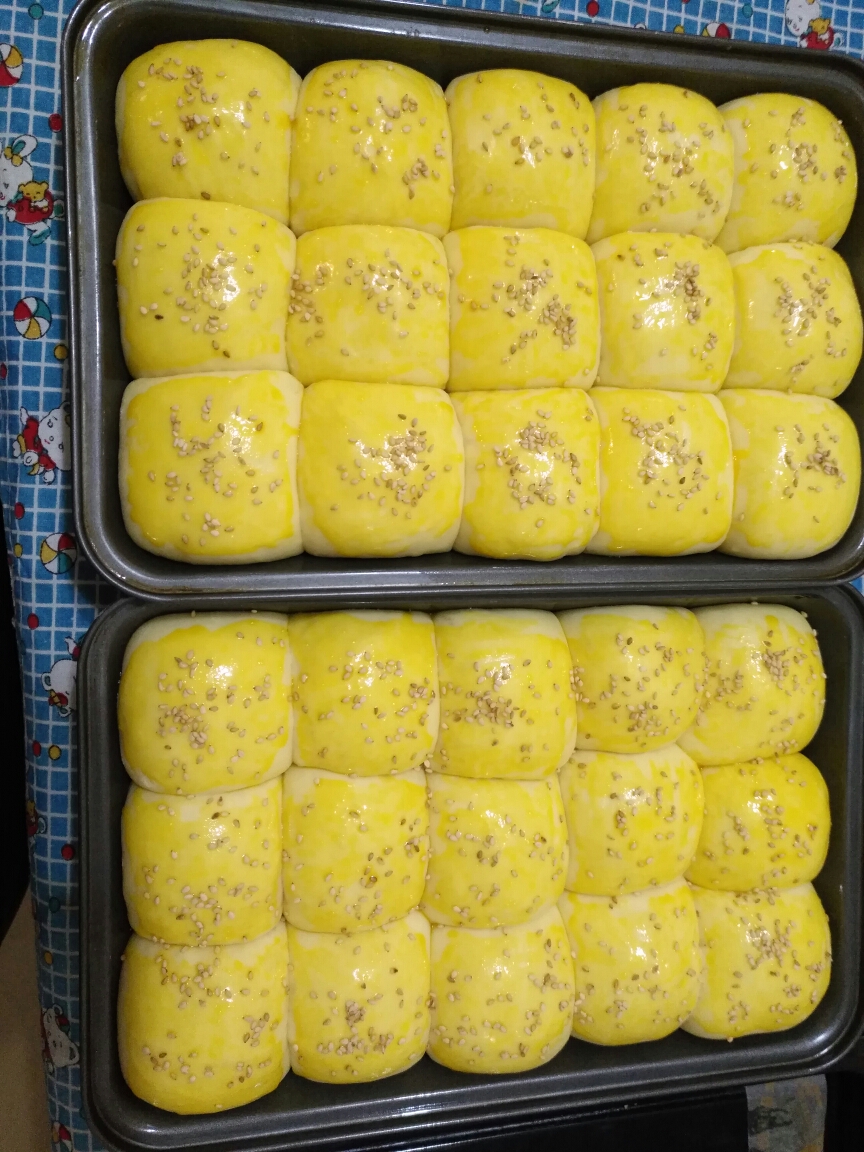 烤箱发酵档37度1小时,放一杯温水在里面,增加湿度,发好后取出表面刷蛋液,撒芝麻