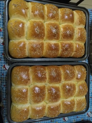 我用的家宝德42升烤箱,两盘刚好,这个方子量比较大,适合人多的家庭,如果你烤箱小或人少,适量减少。温度也看烤箱脾气哦!这款面包,不用淡奶油,同样柔软拉丝,材料越简单,感觉越放心,我经常把牛奶换成同等的水或早上未喝完的豆浆,做出来一样好吃。