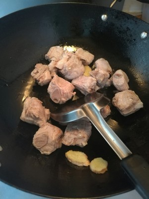 倒油,放姜片和小排一起下锅煸香,可适当多煸一会儿