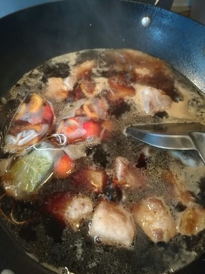 锅内倒入料酒,热水,冰糖,老抽并把之前装完的布袋也扔进去开大火煮,煮开后小火把肉焖稣。
