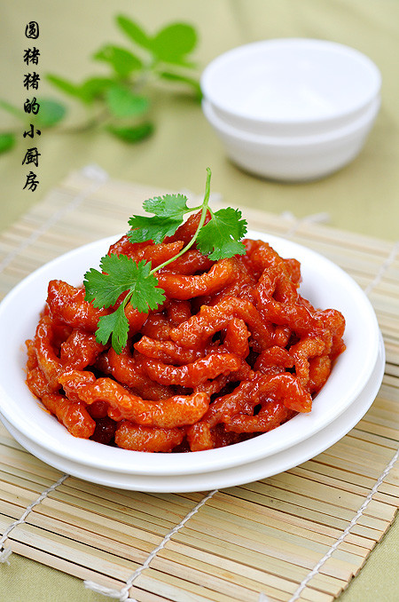 三、最后裹入酱汁时,不要在锅里停留太久,不然肉条吸收酱汁过多,就影响了酥脆口感。