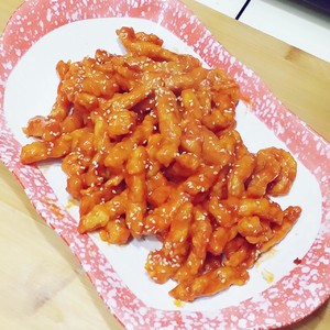 另起一锅,开小火放入番茄酱150g,糖,清水少许烧开,变粘稠,倒入《淀粉+清水》=芡水再次烧开,倒入炸好的肉条,关火,快速翻拌均匀,是使每根肉条都占满酱汁即可,装入盘中,撒上芝麻点缀,啃吧,很香的哦!