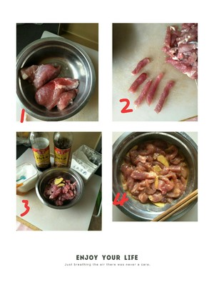 肉切条加适量生抽,料酒,葱,姜,盐,5克淀粉提前腌渍半小时