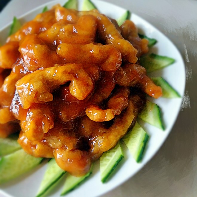 锅里油倒出不用洗,直接倒入酱汁烧到粘稠放入里脊条翻炒均匀,出锅装盘