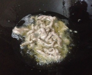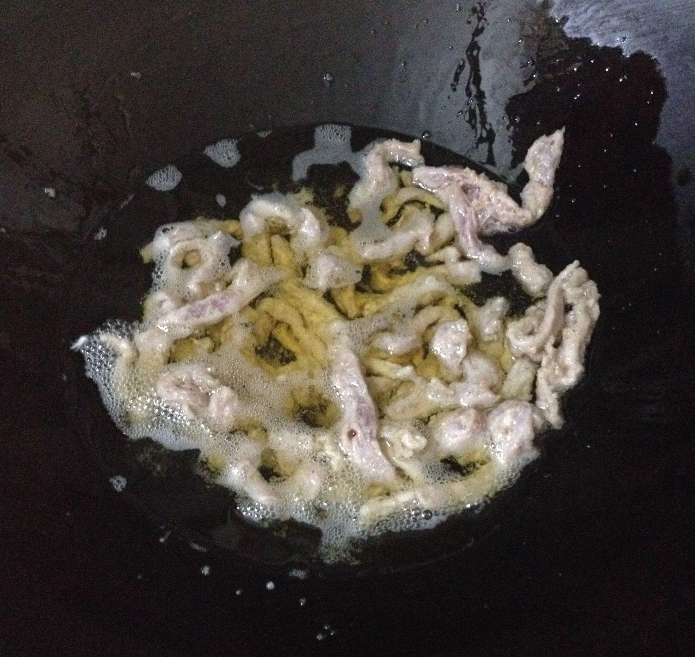 4. 油开放里脊肉下去炸,再次烧开捞起来。