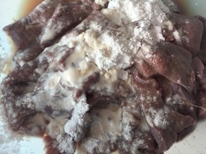 首先买回来的猪肝泡一下血水,用清水多洗几次。全切好之后再用清水冲洗两三遍。加淀粉、料酒腌制30分钟以上。