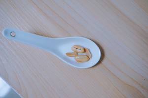 勺子是这样的,普通汤勺,一勺就是一平勺,一勺白砂糖约10g.放几粒花生让大家感受下大小。体贴吧我。??