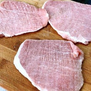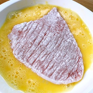 猪排放入面粉中两面均匀沾上面粉,抖去多余的面粉