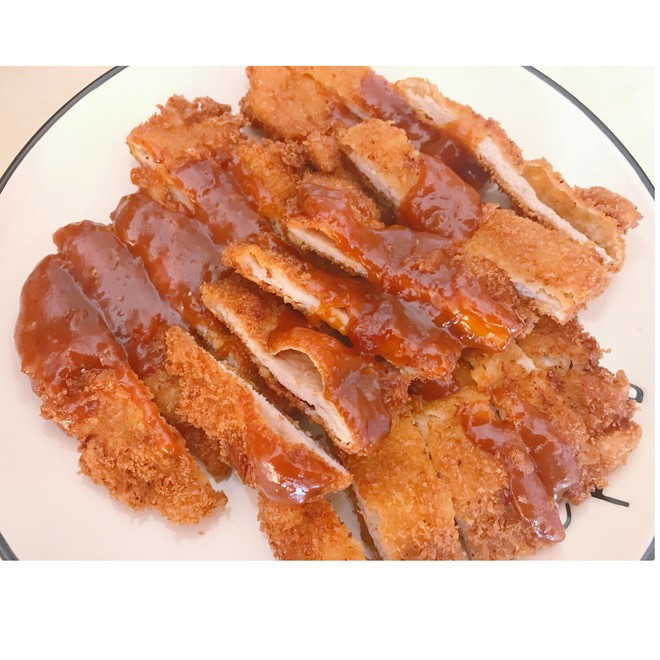 炸好的猪扒淋上自制的猪扒酱汁→伍斯特酱油+番茄酱+黄油