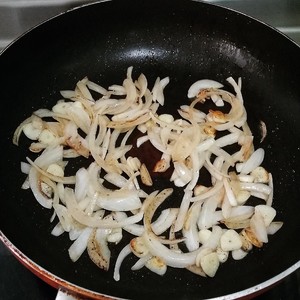 锅烧热,放黄油。大火,先把洋葱和蒜片煎的略微焦黄。