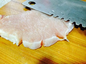 將里脊裝入保鮮袋用鬆肉鎚或刀背錘打鬆弛。