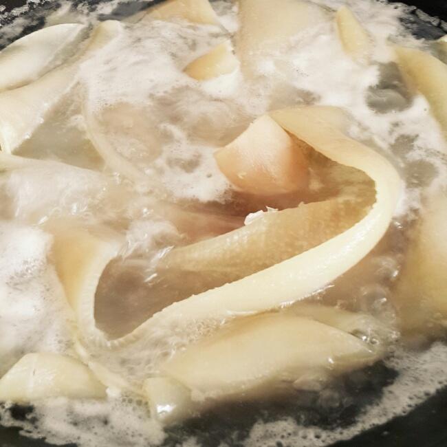 切好的猪皮再次焯水,放入大料,葱姜,料酒,这是为了去味的