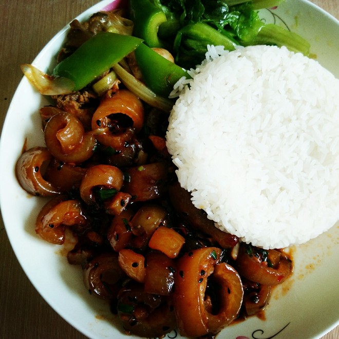 开始煮了。热锅凉油,放蒜沫葱沫煸到开始金黄之后下猪皮翻遍一下,然后把调好的酱料倒锅里,盖上盖子焖。等到水分差不多收干了把蒜苗和芝麻倒进去翻炒到蒜苗熟了就可以起锅了。