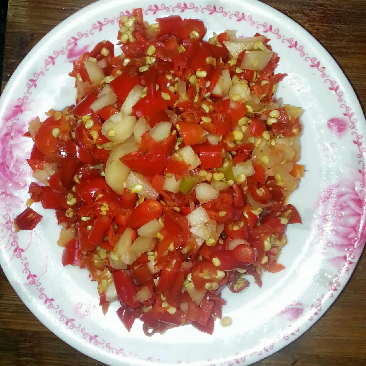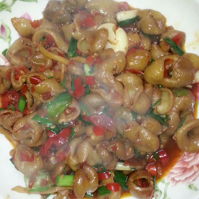 锅里放油,下泡椒,泡姜,蒜子,炒出香味,下切好的大肠炒香,下醬油,加一点点水煮一小会。