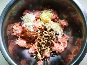 调制馅料,肉馅中加入水、香菇末(干香菇泡发)、葱姜末、黄酱、胡椒粉、盐,搅打均匀,加淀粉调匀摔打。