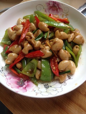 看见大肠表面有点金黄色,把辣椒和蒜姜倒下翻炒几分钟,下葱段和生抽炒一下就可以装盘了