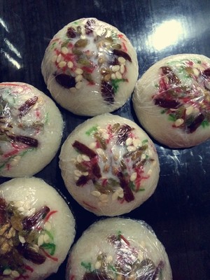 圆糯米隔夜浸泡,蒸熟。同时,取碗抹上一层猪油,摆上喜欢的花头,其实放什么都无所谓,就是要喜庆,开心。