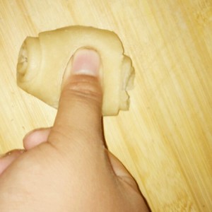 13.取一个醒好的面卷,大拇指按中间。